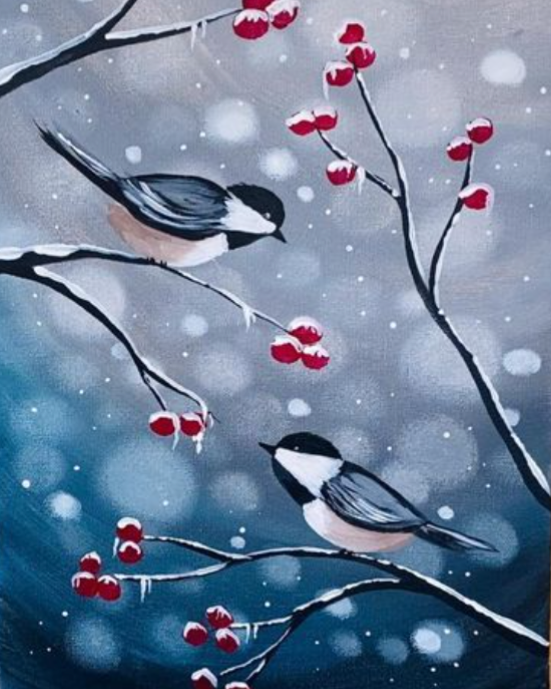 Let’s gather around the table for a cozy Sunday morning of painting, laughter, and quiet creativity. This special Paint & Pause invites you to sip, snack, and create a peaceful winter scene filled with soft snow, gentle branches, and fluttering little birds.